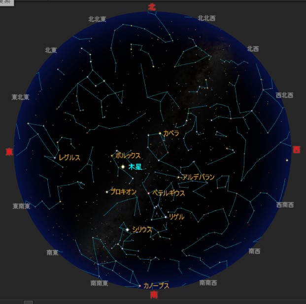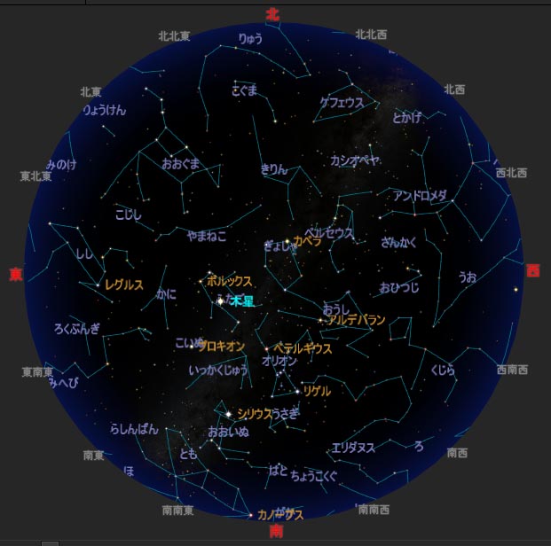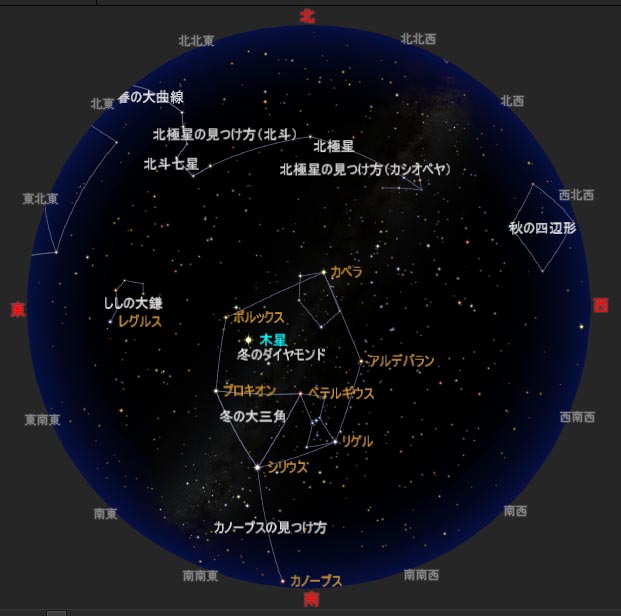 | 2026/2/1 21:00 2/15 20:00 2/28/19:00 ごろの星空です。 (StellaNavigator/AstroArts Inc) |